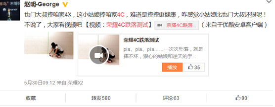 此外,它还通过“砸黄瓜、摩托车轧、油锅里炸以及18楼高空跌落”等一系列考验,再现了无敌品质。作为学生党,在教室、宿舍、操场等地都免不了磕碰,造成手机损坏,但有了如此“抗暴抗虐”的荣耀4C大可放心了。