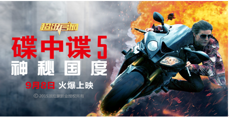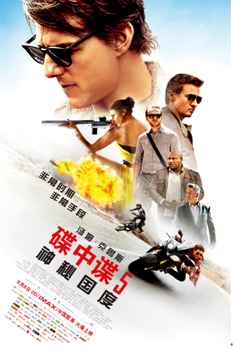 由派拉蒙影业出品,1905影业和阿里影业参与投资、联合出品的《碟中谍5:神秘国度》即将于9月5日-7日全面展开“中国行”路演活动,阿汤哥将与导演克里斯托弗·麦奎里、女主角丽贝卡·弗格森一同来华与粉丝亲密接触,为9月8日正式在中国内地的上映卖力宣传。
