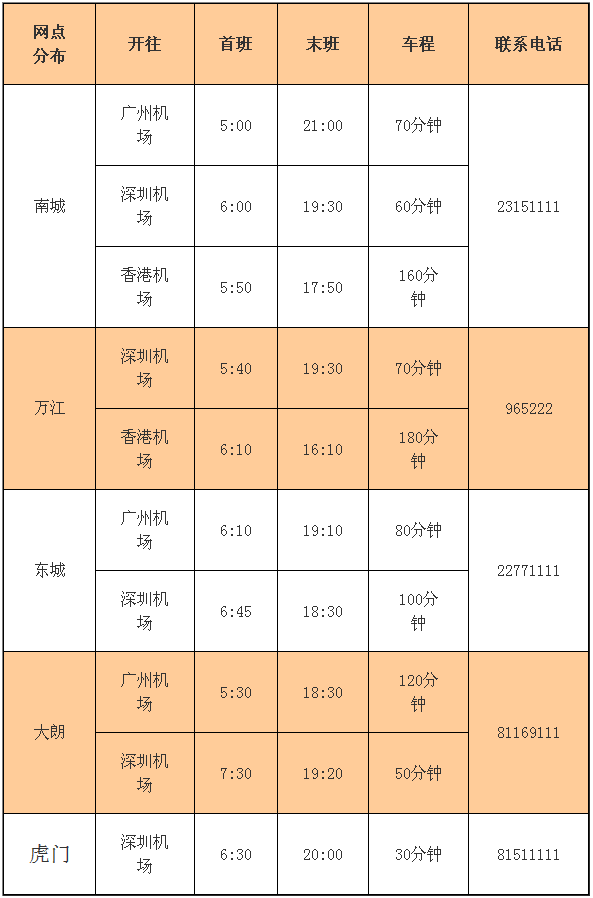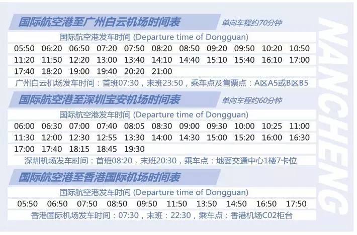 由于本次调整只涉及候机楼的万江站和南城CBD国际航空港,为此候机楼其他营业点的运营班次并不受影响。东城、南城、大朗候机楼均可乘坐前往广州机场的巴士及办理广州机场登机手续。东莞候机楼最新机场巴士往返时间表: