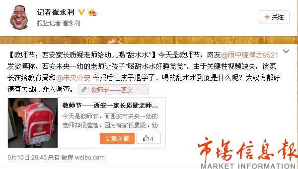 市场信息报【记者 谈春平 实习记者 秦亮】9月10日,网友“@雨中旋律之9521”发布一篇《教师节——西安一家长质疑老师让娃喝啥咧?》的博文。质疑西安未央一幼的老师让孩子“喝甜水水好睡觉觉”。由于关键性视频缺失,该家长在给教育局和@未央公安举报后让孩子退学了。