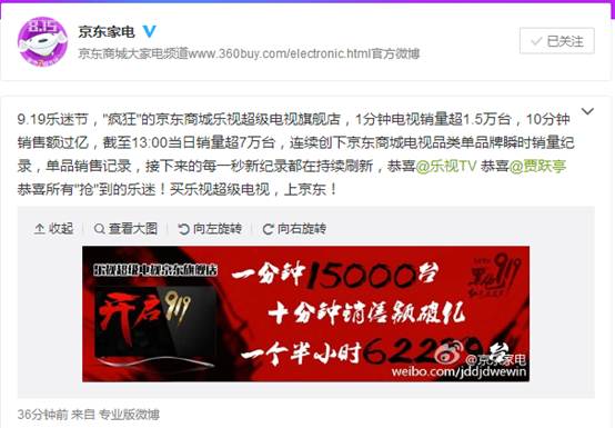 9月19日上午10:00乐视“919乐迷节”正式启动,截至下午15:00,乐视超级电视X60 S现货已售罄,该产品均转为预售模式,在“919乐迷节”期间预定产品的乐迷同样可以享受直降500元的优惠政策。同时,据京东第三方数据显示,乐视超级电视仅用3个小时销量超7万台,打破京东商城单日单品牌电视销量纪录。