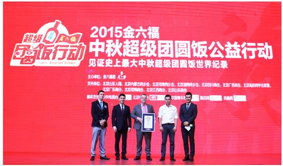 1000多双碗筷、1000多杯福酒、1000多名全国各地老乡同吃中秋团圆饭……9月19日,2015金六福“中秋超级团圆饭”公益行动启动现场,挑战“史上最大中秋超级团圆饭”吉尼斯世界纪录活动举行。除19日北京黄河京都会议中心主会场外,全国近300个分会场数十万名老乡将同期共吃“超级团圆饭”,共同向新的吉尼斯世界纪录发起挑战。