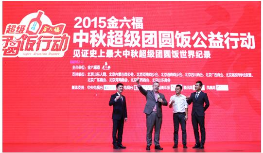 9月19日,距离中秋还有一周,一桌中秋超级团圆饭却已在全国范围内温情开餐。由金六福联合央视著名主持人赵普、公益名人邓飞、北京电视台、凤凰网,及各大商会、同乡会、工会等社会各方力量共同发起的2015金六福“中秋超级团圆饭”公益行动在全国正式启动。当天,在北京主会场黄河京都会议中心,1000多名老乡齐聚一堂,共享“中秋超级团圆饭”,欢聚中秋。活动得到了CCTV、北京电视台、中国青年报、凤凰网、腾讯网等国内众多权威媒体以及机构的大力支持,在中秋前夕,引发了一场全民参与的中秋团圆饭热潮。