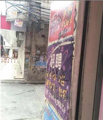 在厚街的康乐路,分布着一些美容机构与整形机构,在路边还能看到一些美容院招收学徒的小广告。