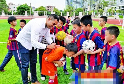 巴西球星内马尔的前队友(白衣男子)在阳光五小和校队球员互动