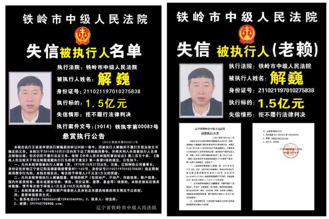 据该公告内容称:铁岭市中级人民法院在执行王某某申请执行解巍股份转让纠纷一案中,因被执行人解巍拒不履行生效法律文书确定的义务,该法院已于2014年10月31日向其下达了限制高消费令,并将其列入失信被执行人名单,并限制出境,但其仍不履行法定义务。