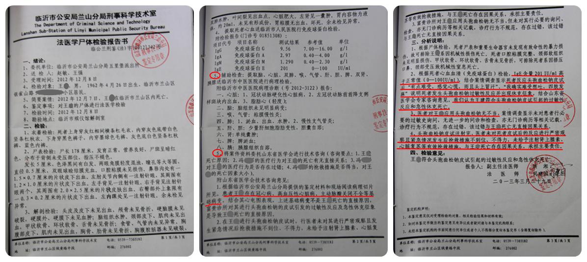 王某死亡的时间是几时几分?临沂市人民医院负责抢救的医生应该十分明确!至于死亡地点,公安机关难道连死者在哪里死的都不知道?120急救车把王某拉到哪里去了?为什么对120急救车将王某拉到临沂市人民医院抢救的事实只字不提?王某的死亡原因,临沂市人民医院急救室难道真的不知道?皮试过敏不过敏,一般来讲,就连普通人都能分辨的出来。皮试部位没有过敏反应,怎么认定王某过敏?王某曾有过心脏病发作史,作为法医,难道没有按规定调查死者生前病史?尸体检验报告书是重要的、严肃的鉴定文书,行文、措辞都有相应的规范和要求,洪湘主任怎么会让报告中出现两个“第五条”?