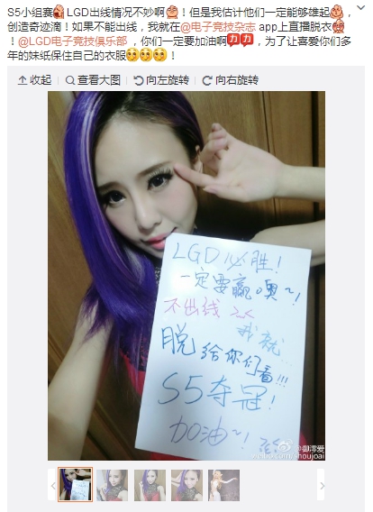 而LGD战队在国内人气一直很高,支持他们的粉丝并没有对于战队放弃希望。一位叫做@御澪爱 coser便发布了一条微博,表示了对于LGD战斗的支持,并且宣称如果LGD未能在S5小组赛之中突围,她便愿意在电子竞技app 上直播“脱衣”。