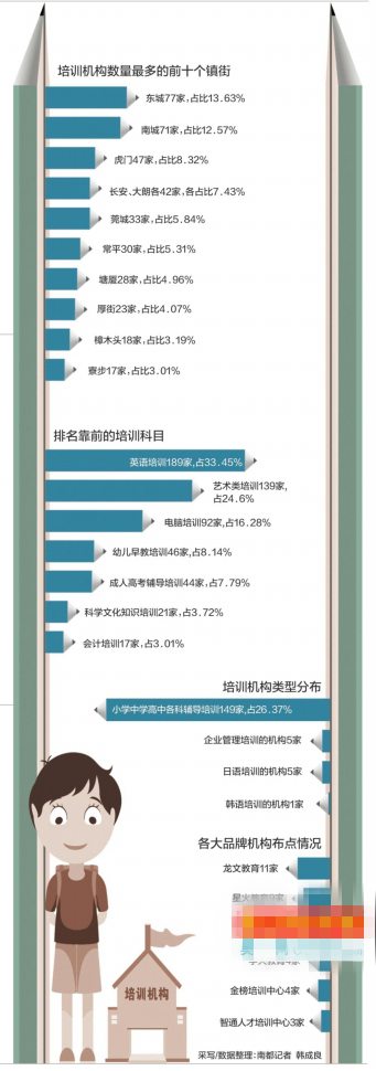 据记者统计,截至今年9月,东莞全市共有565家民办教育培训机构。其中东城77家、南城71家、虎门47家,数量列全市前三。培训机构数量前十名的镇街,基本是东城、长安、厚街、常平、塘厦等经济重镇,这些镇街人口多、经济发达,对各类教育的需求量也十分庞大。