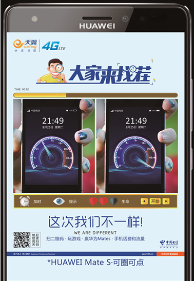 但与以往不同的是,这个“大家来找茬”游戏,登陆微信客户端。以后大家不仅能在电脑上玩,微信上也能玩这款游戏。市民只要关注“东莞电信”官方微信公众号或扫描东莞电信框架广告上的二维码就能直接参与游戏,在微信端上体验眼疾手快的快感。
