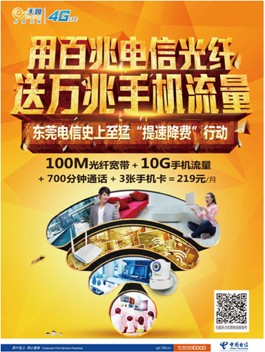 为了让更多的市民能够享受电信的优质服务,东莞电信特别推出了众多优惠政策的219双百兆套餐,以更为诚意的态度、更优惠的价格以及更好的服务,来赢取消费者的心。东莞电信此次推出的219双百兆套餐,包含100M光纤宽带、10G手机流量以及700分钟通话,一个套餐3张卡。每月仅需要219元,就能优惠全家共享,实现多终端上网,iPad电脑手机一次性搞定,10G流量更能分享给好友,一次性解决家里全部设备上网、通话问题。