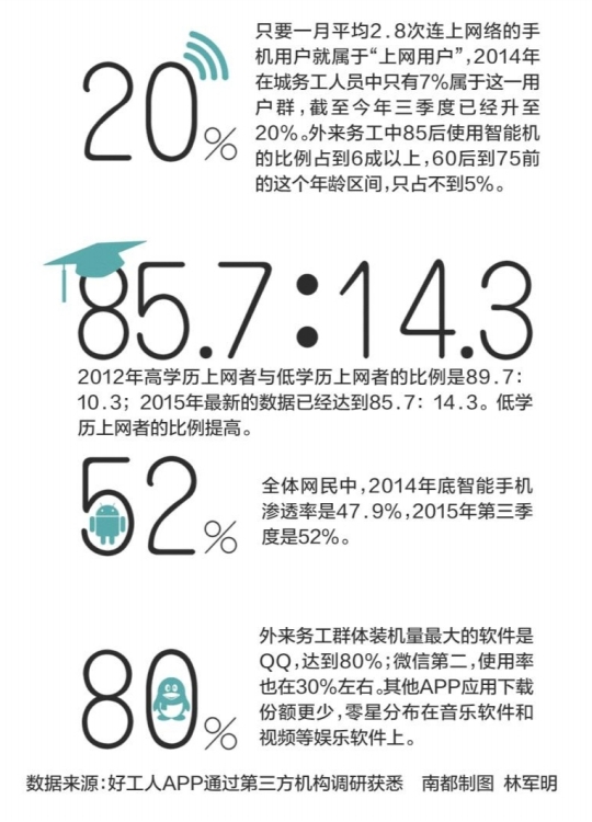 工资在提高,蓝领工人的手机使用数据,就是在最近一年高速增长。聂景云请第三方机构做过一个调研,2014年底,智能机在中国城市外来务工人员的普及比例为47%;2015年前三季度的数据达到68%。只要一个月内平均2.8次连上网络的手机用户就属于“上网用户”,2014年在城市务工人员中只有7%属于这一用户群,截至今年三季度已经升至20 %,是去年同期的三倍。