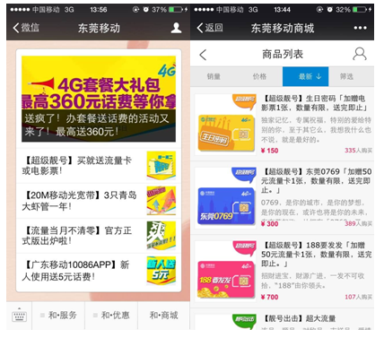 更多超级靓号尽在东莞移动商城!流量卡、电影票数量有限,先到先得,,用户可以通过关注东移动官方微信点击“和•商城”进入。