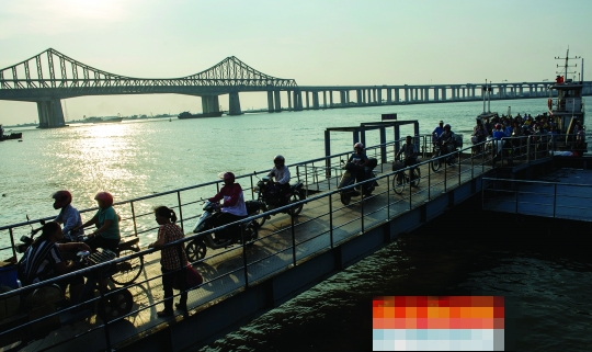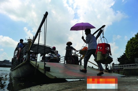 泥洲岛渡口,乘客有序地上岸。广深沿江高速开通后,这里不再是连接沙田镇区的唯一通道。