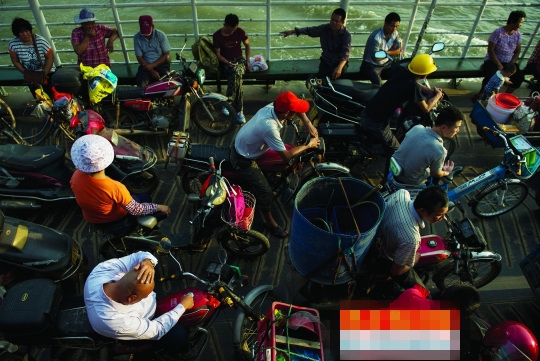 从沙田往泥洲岛的渡船上,乘客大多是岛上居民。