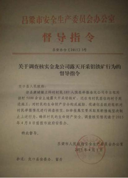 交口县政府及各职能部门不作为,使村民的诉求石沉大海,让村民屡遭疑似黑社会人员的打击报复。几年来村民的上访材料逐级返回交口县政府,但交口县政府从未做过实质性的处理。村民遭到疑似黑社会性质报复后,5月26日曾向交口县政府递交了请求人民政府保护生命财产的请愿书,可是非但没有得到保护,反而受到了更为残酷的迫害。吕梁市安监局4月1日下达了关于金龙公司非法租用5000亩土地进行露天开采的督导指令,但交口县国土局和安监局并未执行上级政令,一直包庇金龙公司私挖盗采。村民多次向交口县国土局安监局举报金龙公司破坏土地和挖盗采国家资源,但国土局和安监局并未进行实质性的制止,直至现在还在继续破坏。这5年来,一直在任交口县国土局局长的冯建平,对金龙公司的这种违法行为不但未予以制止,而是相互勾结,纵容包庇金龙公司。就在今年8月8日开始,无论村民怎么向冯建平局长举报反映,冯总是不予制止,任由金龙公司非法破坏土地及盗采国家资源。8月20日,当事人又去打冯建平局长,冯局长说反映的金龙公司私挖盗采的事是存在的,但他没有强制制止的权利,让当事人找县里。至于破坏土地的事,国土法(不记得多少条)里有,当事人可以向人民法院诉讼。另据知情人士透露,冯建平还向金龙公司透露举报人信息,使村民屡次遭受金龙公司雇佣疑似黑社会人员的打击报复。还是在8月20日,当事人找县安监局冯星局长,请求其制止破坏其家宅基地。冯星局长说,制止不是安监局一家的事,并特意提醒当事人,挖当事人房子那块地不在开采界内,不由他管。