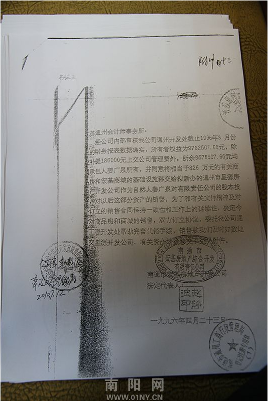 1996年4月23、24日,姜广泉以宏基公司的名义,向江苏通州会计师事务所,提交了两份“文件”, 称扣除上缴公司管理费40万,宏基公司同意将826万资产转让给星源公司作注册资本,资产销售款全部打入星源公司。826万,包括宏基商城基础设施和宏基1号、2号住宅楼,并且未经评估。