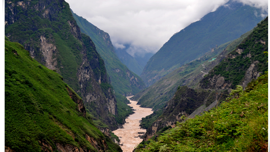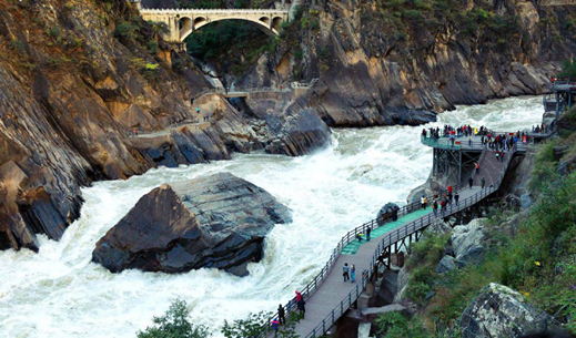 “在大云江的尽头,数百米宽的江面陡然收缩成十来米的激流,两块巨石隔岸矗立,相传,老虎从这里跳跃过江。流不尽的云江水从这下面轰隆隆地落入地下,只须一分钟左右的地下奔腾,再见天日时已经属于异国。”这就是虎跳峡地形的由来。除了壮丽的峡谷景观,虎跳峡还是世界著名的高路徒步线。其中虎跳峡徒步线被誉为“世界十大经典徒步线路之一”,主要由高路徒步线和中虎跳峡徒步线两大部分组成。