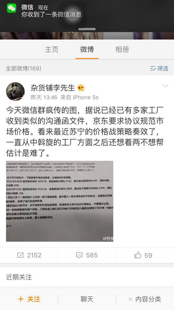 从流出的微博截图上可以看到,西门子品牌一款型号为WM10P1601的洗衣机,苏宁售价为2990元,京东售价为3924元,苏宁价格比京东便宜近千元,致使“本身已在京东下单的客户,比价后全部取消订单,转移到易购购买,甚至其他型号也会不同程度的转移”。