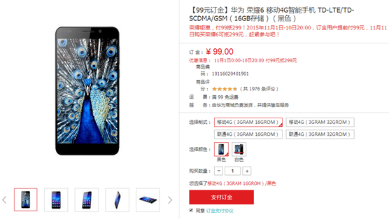 荣耀双11耀眼而来,荣耀6直接优惠200元!
