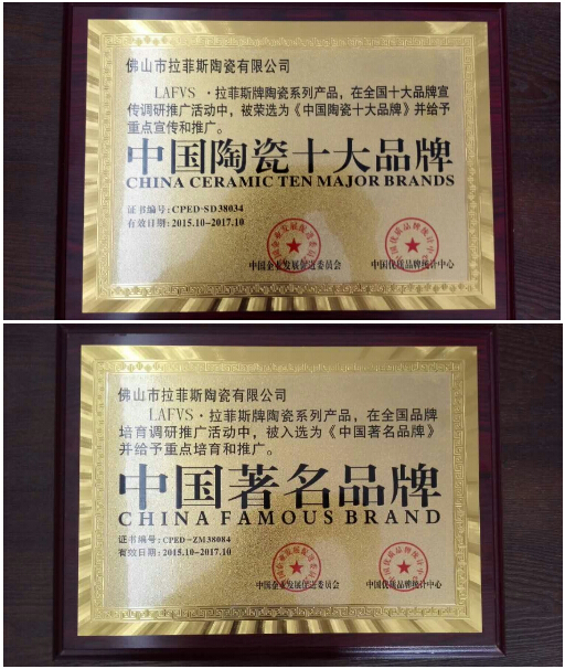 近日,佛山拉菲斯(LAFVS)陶瓷喜获中国著名品牌和中国陶瓷十大品牌两项殊荣。
