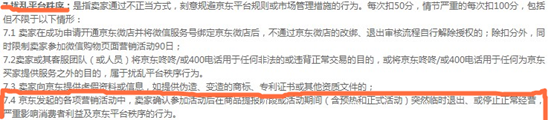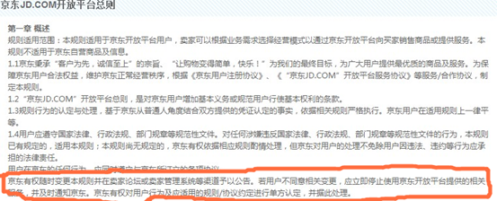 商家的紧张并非没有道理,因为在平台规则面前,他们处于弱势地位。记者在京东首页的“商家入驻规定”中看到,不少“霸气条款”都很难让商家有安全感。其中,接受记者采访到的商家们屡屡提到了《总则》里的一些描述:比如,京东有权“随时变更”本规则并在卖家论坛或卖家管理系统等渠道予以公告,京东有权对用户行为及应适用的规则/协议约定进行“单方认定,并据此处理”等等。此外,京东还可以根据情况认定商家“扰乱平台秩序”,对此商家认为,京东并非执法机关,无权设置类似于现实生活当中的“寻事滋事”等罪名。