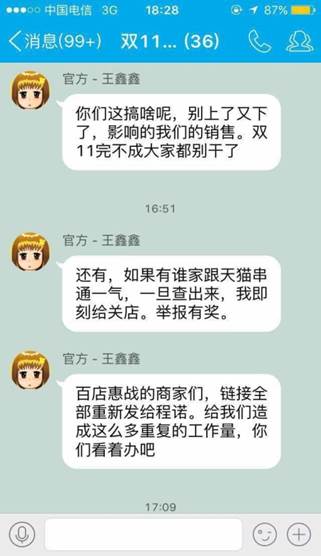 一位三只松鼠员工对于QQ群里发生的事情感到非常难堪,“人为刀俎我为鱼肉”,他认为,虽然天猫的运营也很强势,但“京东才是‘二选一’的真正实施者,以三只松鼠和木林森为代表的商家成了为‘双11’大平台角逐的祭品,是真正的受害者。”部分接受采访的商家对记者证实,上述截图里的张雨确为京东蜜饯坚果类目的产品经理。“关键先生”徐新知情人士对记者证实,三只松鼠能恢复在京东上架,起到关键作用的,是同为三只松鼠和京东投资人的徐新。