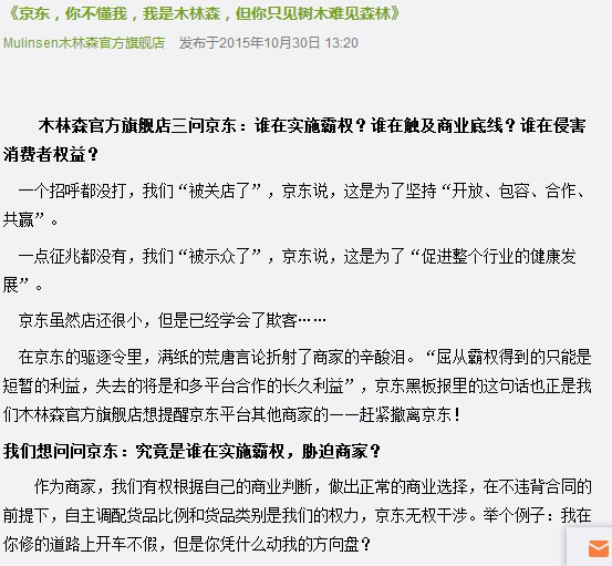 上述原因也可以解释木林森此前在被京东清退后,为何口气依然强硬,甚至发公开信表示自己永远退出京东,并号召其它商家也退出京东。