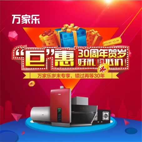 11月1日,万家乐“30周年贺岁‘巨’惠 好礼!低价!”促销活动先于双十一拉开帷幕,活动将一直持续至12月30日。期间,众多明星产品悉数登场,时间跨度、规模均空前,其中包括“30年辉煌同乐,满千返百”、“辞旧迎新抵现金”、“贺岁享好礼”以及“玩微信乐分享,100%中大奖”四重好礼享不停,真可谓是消费者年前选购万家乐产品的最佳时机。