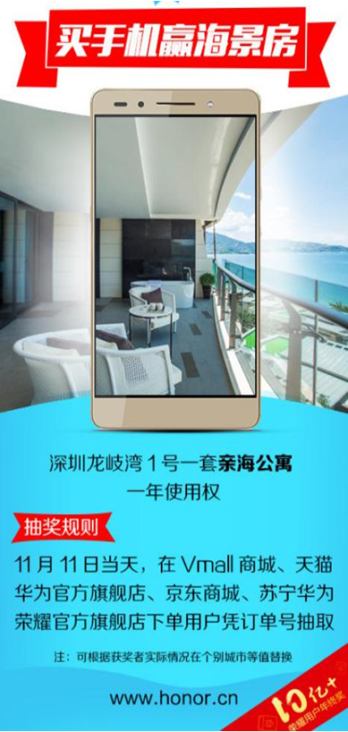好礼拿不完,优惠送不停!荣耀双11进入倒计时,购机抽海景房、赢贴膜、满减券减免等多重优惠触手可及。荣耀畅玩4C增强版作为荣耀旗下热销机型,虽仅售799元起,但11月11日,凡在天猫、京东、苏宁易购、华为商城四大平台的荣耀畅玩4C增强版购机用户,不仅可免费获得手机贴膜一份,还有机会赢取深圳龙岐湾1号一套亲海公寓一年使用权!此外,在华为商城或天猫华为官方旗舰店两大平台购机还可提前领取店铺优惠券,满700元即可减免30元,尽享钜惠狂欢。
