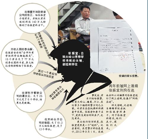 目前,东莞大岭山、塘厦、万江、东坑等多个镇街的警方均已受理家长的报警。令人诧异的是,调查发现,张振堂在2013年就因诈骗被东城警方网上通缉。
