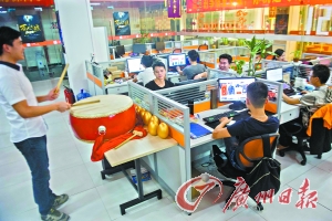 昨晚,虎门电商园内,阿里巴巴东莞地区授权渠道推广商通过击鼓给员工鼓劲。记者 葛宇飞 摄