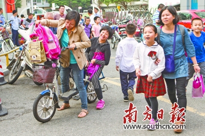 去年4月,东莞市敦促学校严格控制学生在校学习时间,其中小学不超过6小时。此外,南城、东城、莞城等公办小学陆续取消午托,家长的接送任务增加1倍,只能各显神通,夫妻“两班倒”、请家里的老人出马、将孩子交给接送站……
