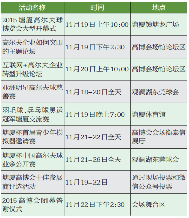 同时,在4天的展会期间,组委会还将举办10项精彩纷呈的高博会系列主题活动,包括:大型高博会开幕式、高尔夫产业发展论坛、如歌捐赠模拟器教学设备仪式、2015塘厦杯中国高尔夫球业余公开赛、首届塘厦杯青少年模拟器邀请赛、羽毛球、乒乓球奥运冠军塘厦交流赛、2015亚洲明星高尔夫慈善赛、评选塘厦高博会十佳参展商等。展会活动从11月18日持续至26日,确保展会的人气。其中塘厦杯青少年模拟器邀请赛、乒乓球羽毛球奥运冠军塘厦交流赛、评选塘厦高博会十佳参展商等活动都是首次策划,希望借助这些活动,让更多的普通市民尤其是青少年参与高博会,了解高尔夫这项健康、绿色的体育运动,扩大展会的参与人群,为展会带来更多专业观众。