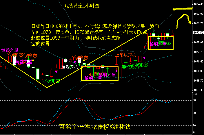 现货黄金昨日收线长引线的十字K,更多的是走一个震荡,而不是延续跌势。同时小时线上,从下图中我们可以看到出现了明显的起涨信号,黎明之星,这也是我早间一开始让大家1073一带做多的原因,有的时候,你会发现很多人趋势看的对了,却总是差一步,要么单子进早了,要么进晚了,K线理论外加波神凯线精准预测进场点位,有时候技术指标的魅力,你不得不赞叹。那么今天欧盘同样是关键时间点,上方阻力1082-83一带,这也是我们考虑首次做空的位置,下方支撑1070.