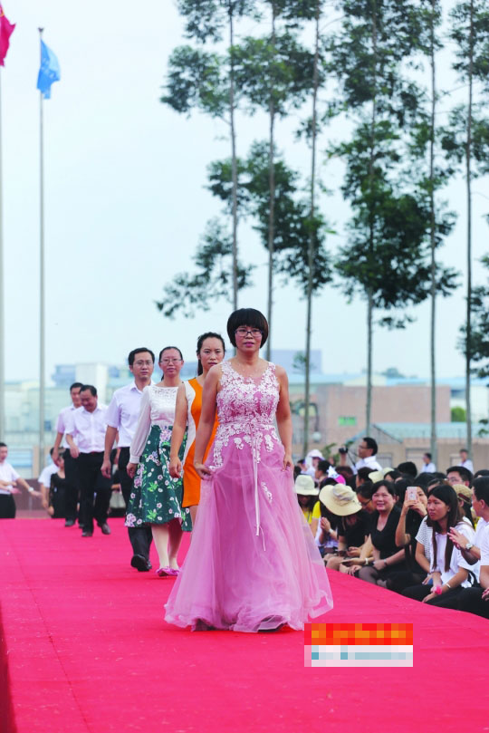 盛装的老师和学生,走在临时搭建的60米长铺着红色地毯的T台上,边走边朝底下挥手,底下的人也纷纷报以掌声回馈。