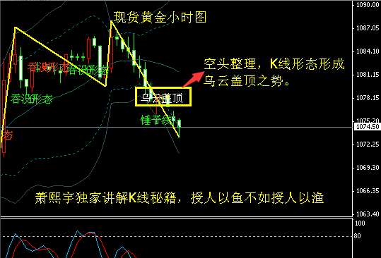现货黄金日线上再次走弱,启明星带来的反抽,周五没能得到延续,因此这只能当做下跌中的休整,今日再次看空。关于黄金趋势我需要强调两个点,上方1095趋势分界线,当行情未能突破企稳此位置,不谈多头的反转。而今日我们需要关注的是1085一线。当这种极弱势行情的下跌,不能去等待大的反弹在空,真到等到了,反而不能空了,因此早间操作激进的现价1075-76可进底仓空单,损1081.即可。小时图K线出现乌云盖顶。经典技术给出信号。