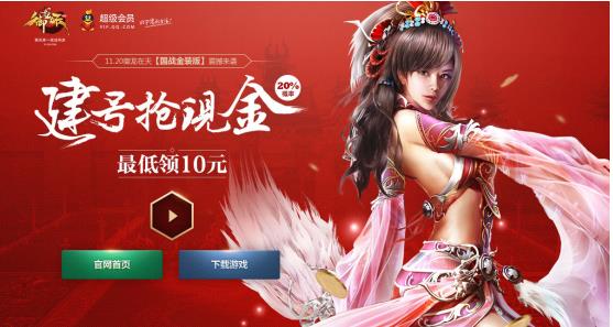 ■免费领!全民嗨不停!11月20日起,40级以上玩家可在王城NPC(622544)处,免费领取内含藏衣阁“百战金甲”新时装、防装随机部位黄金精源的黄金惊喜礼包,让御龙满城尽是黄金甲!此外,新注册的玩家进入新服【金装国战】,有机会领取10元现金,还有更多高面值现金、极品道具奉送!