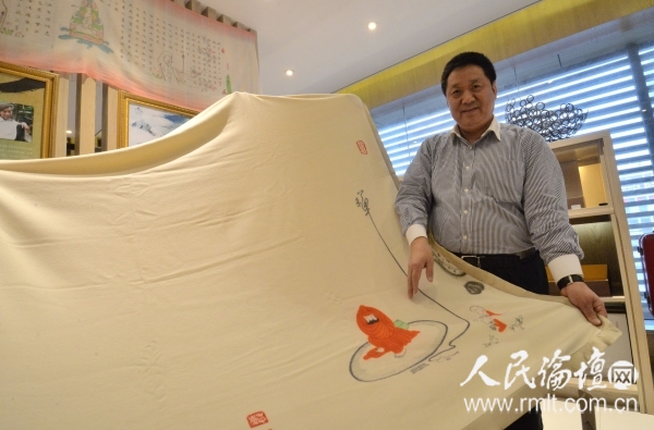 公司董事长张帅奇欣赏自己设计的“水墨藏绒”制品 郝群英 摄