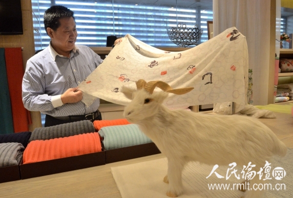 就在羊绒加工生意做得风生水起时,圣雪海公司的目光瞄向了品牌创建。公司董事长张帅奇欣赏自己设计的“水墨藏绒”制品 郝群英 摄