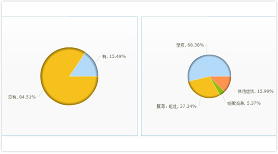 调查显示,15.49%的宝宝有过对奶粉过敏的情况,也就是说,每6个宝宝中,就有1个宝宝有奶粉过敏。在出现过敏情况的宝宝中,68.38%的宝宝出现了湿疹,37.34%的宝宝出现了腹泻、呕吐的症状,5.37%的宝宝有咳嗽、流鼻涕的现象。由此可见,宝宝奶粉过敏最常见的表现是长湿疹,应该引起妈妈们的重视。