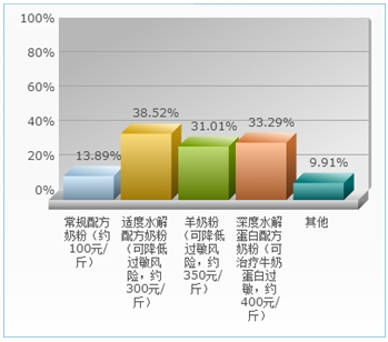 调查显示,对于市场上比较普遍的三种低敏奶粉:适度水解配方奶粉、深度水解配方奶粉和羊奶粉,妈妈们并没有严重偏向,各占三成。