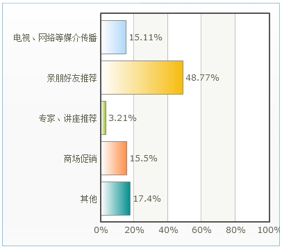 在参与调查的妈妈中,近半数妈妈都是通过亲朋好友的推荐选择奶粉,由此可见,比起大众传播媒介和育儿专家,妈妈们在选择奶粉方面,更愿意相信身边朋友们的经验。"XX喝过某个牌子,觉得不错"的这种口碑相传是妈妈们最信赖的方式。此外通过商场的促销选择奶粉的妈妈仅有15.5%,说明价格上的优惠、促销活动对妈妈的购买选择影响并不大。