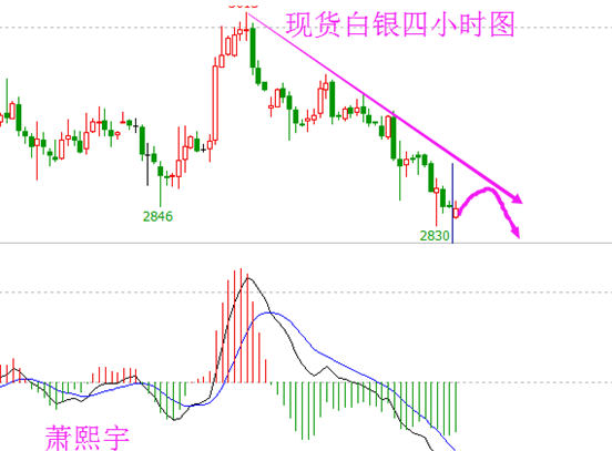 现货白银,白银近两日走的比之黄金更加给力,空头持续发力,连续破底新低,同样的下跌无回撤,横盘整理,那么很明显了,我们还是做极弱势处理,依旧看空不变。上方阻力2900一带,进场位置我们放在昨日反抽的高点2860-70一带,损放在2900,下方支撑2830-2800.四小时空头下行趋势保持完好。我们顺势而为变好。