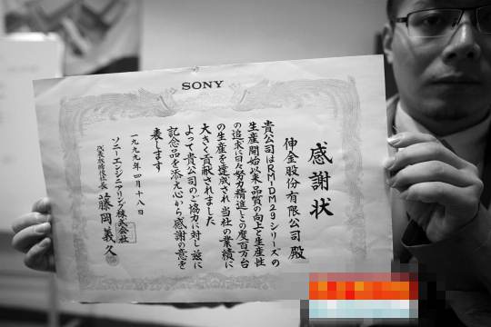 S O N Y给伸金公司的感谢状在旧厂房被发现。