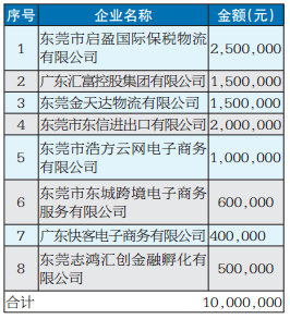 记者在文件上看到,东莞市启盈国际保税物流有限公司获得专项资金金额最高,为250万元;其次是东莞市东信进出口有限公司,200万元;广东汇富控股集团有限公司、东莞金天达物流有限公司获得专项资金150万元。