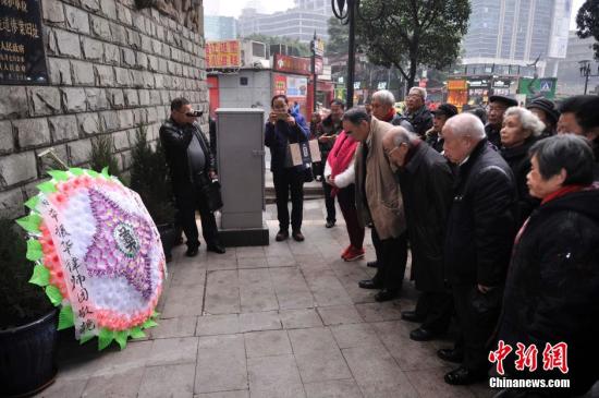 1月1日,重庆大轰炸民间对日索赔案日本律师团团长田代博之和律师一濑敬一郎赴重庆,声援重庆大轰炸民间对日索赔案原告团并介绍索赔案上诉情况。在重庆大轰炸“六五”隧道惨案旧址前,日本律师团的田代博之和一濑敬一郎律师向重庆大轰炸遇难者三鞠躬并敬献花圈。据悉,2016年3月份,东京高等裁判所将对重庆大轰炸民间对日索赔案二审开庭审理。图为重庆大轰炸民间对日索赔案日本律师为大轰炸遇难者送花圈。 陈超摄