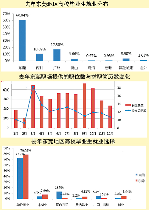 东莞区域高校毕业生中,60%以上的应届生选择留在东莞工作。其次,流向深圳、广州两大近邻的一线城市同样占有一定比重。