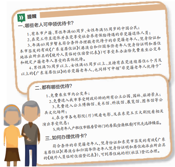 修订后,非莞籍老人也大为受惠。记者从中看到,这次将优待对象范围从本市户籍老年人扩大到常住本市的非莞籍老年人,即“在莞工作至退休并在莞享受社会养老保险待遇的非莞籍退休人员办理‘东莞市非莞籍敬老优待卡’”。