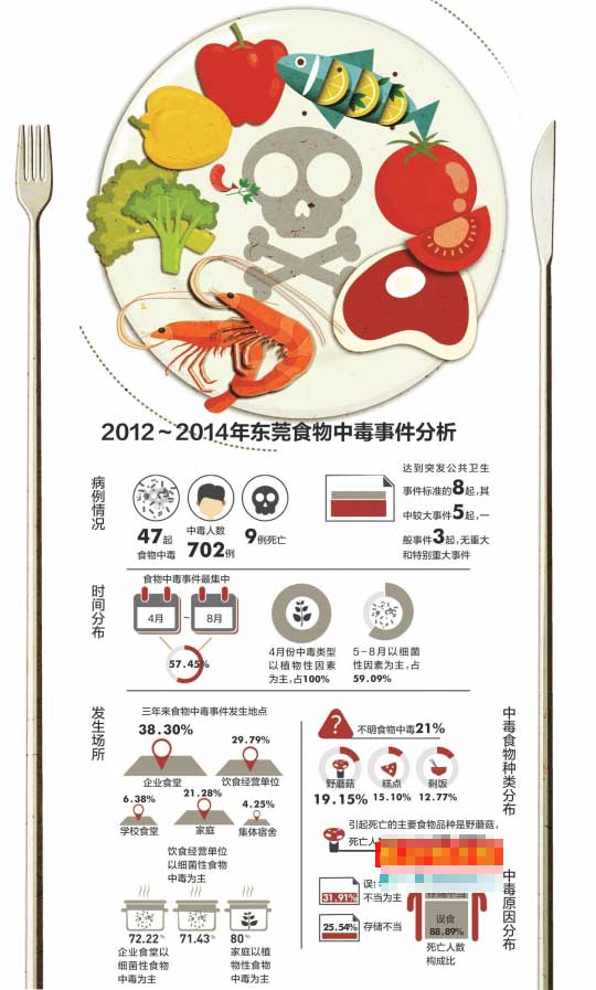 2012至2014年的三年间,东莞共报告食物中毒47起,中毒人数702例,其中有9人因食物中毒而死亡。昨日,记者了解到,东莞市疾控中心4名专家就2012~2014年全市发生的食物中毒事件进行了原因分析与评估,他们发现,在东莞食物中毒因素中,野蘑菇是“头号杀手”,三年间,因误食野蘑菇中毒死亡的就有8人。而东莞最常发生食物中毒的月份主要集中在4~8月,企业食堂是食物中毒发生的第一大场所,多是因为食物加工、储存不当导致。